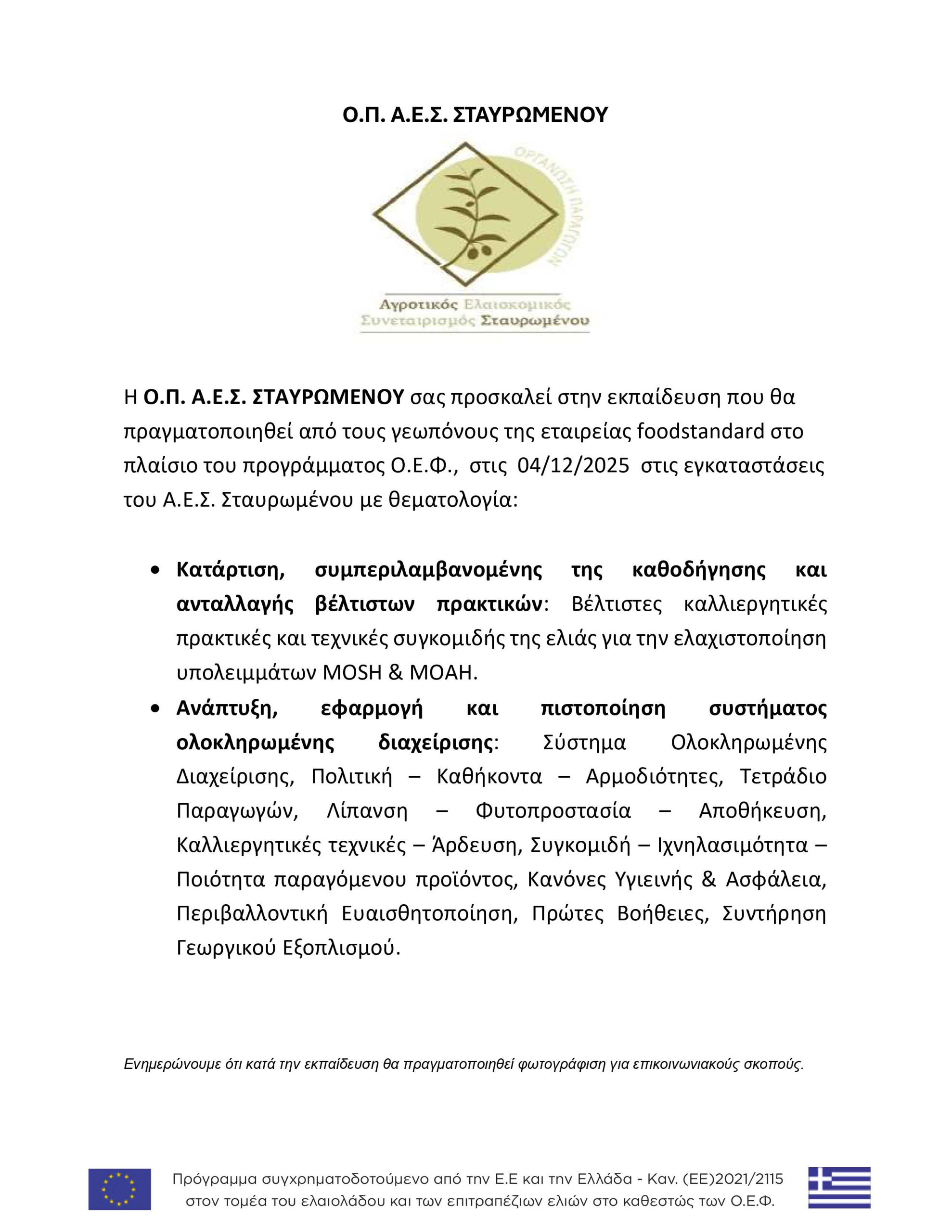 Πρόσκληση εκδήλωσης ενδιαφέροντος για την επιλογή Αναδόχου με σκοπό την πιστοποίηση της Ο.Π. ΑΓΡΟΤΙΚΟΣ ΕΛΑΙΟΚΟΜΙΚΟΣ ΣΥΝΕΤΑΙΡΙΣΜΟΣ ΣΤΑΥΡΩΜΕΝΟΥ βάσει των προτύπων που εφαρμόζονται στις Παρέμβασεις Π2-47.OL-1ζ και Π2-47.OL-1η στο πλαίσιο του εγκεκριμένου επιχειρησιακού προγράμματος εργασίας Ο.Ε.Φ. σε εφαρμογή του Καν. (ΕΕ) 2021/2115 στο πλαίσιο του ΣΣ ΚΑΠ 2023-2027, για την τετραετία 2024-2027.